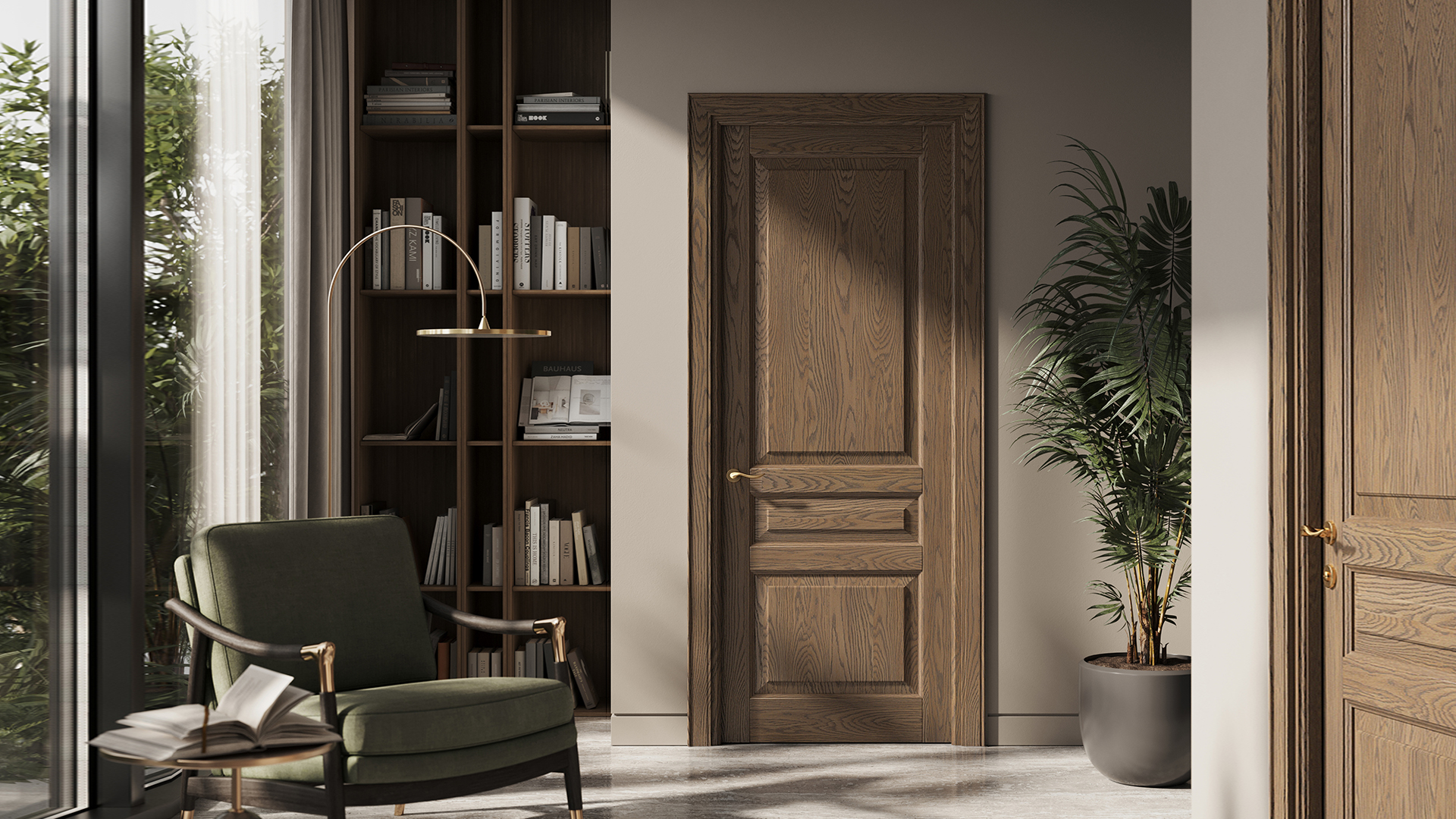 Традиционные формы с элементами из массива дуба и бука в отделках, максимально раскрывающих природную красоту дерева. Двери с классической деревянной решёткой созданы специально для парадных проёмов.