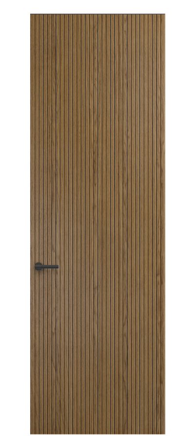 SELECT — коллекция минималистичных дверей с фрезеровкой по натуральному шпону. Рельеф на поверхности полотна создаёт игру света и тени, добавляя пространству динамичности и визуального объёма. Двери SELECT в сочетании со стеновыми панелями и мебельными фасадами, повторяющими лаконичный дизайн, создают единое стилевое решение.